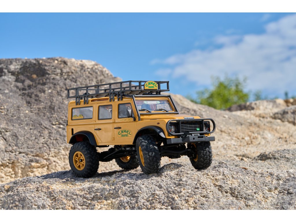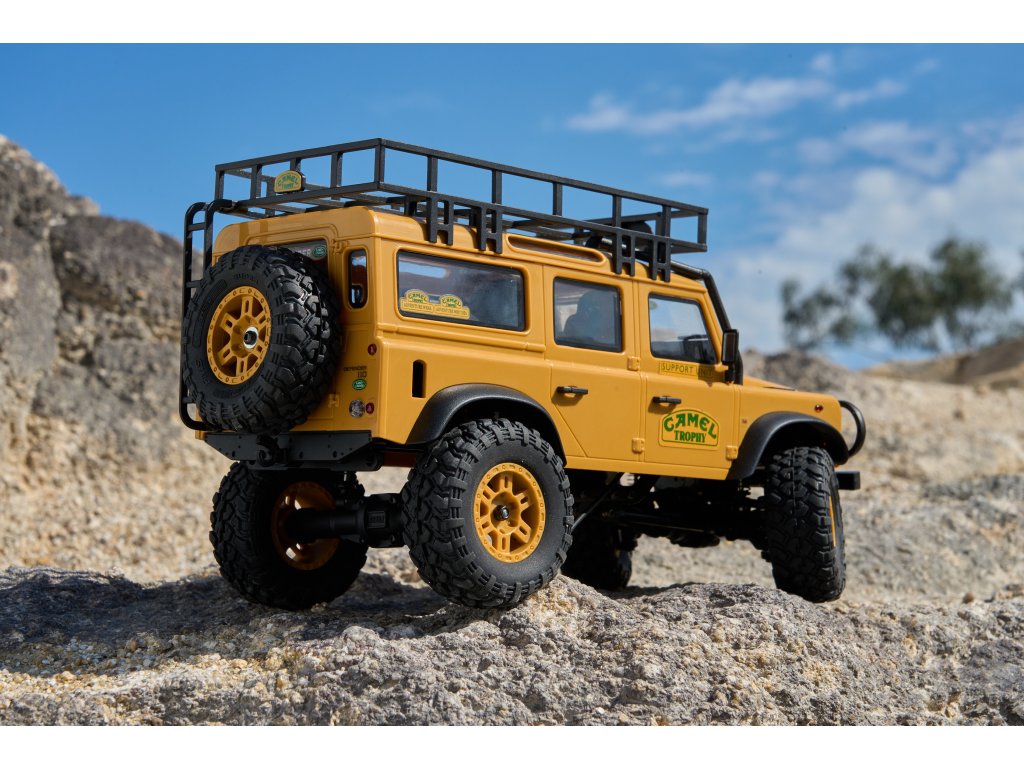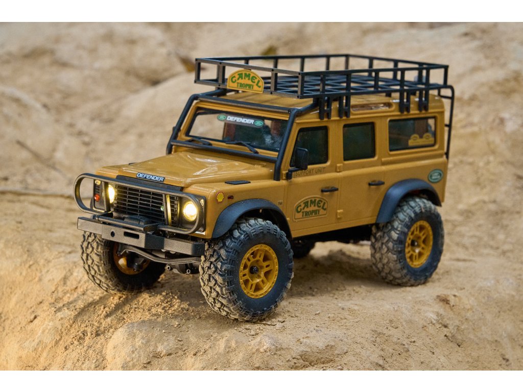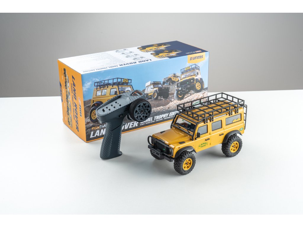 Model FMS FCX24M Camel Trophy Land Rover Defender 110 1:24 RTR je oficiálně licencovaný společností Jaguar Land Rover Limited a přichází s moderním podvozkem nové generace FCX24M. Robustní konstrukce využívá kovové šasi ve tvaru „C“, zatímco karoserie z tvrdého ABS plastu zajišťuje vysokou odolnost v náročném terénu velice realistické chovánï. Díky dvourychlostní převodovce si model poradí jak s rychlejší jízdou ideální pro delší přejezdy nebo sypký terén, či bláto, tak s pomalým technickým plazením. Offroadové pneumatiky poskytují skvělou světlou výšku a výbornou průchodnost terénem. Celý dojem dotváří střešní nosič, který je nainstalován již z výroby, stejně jako další doplňky.