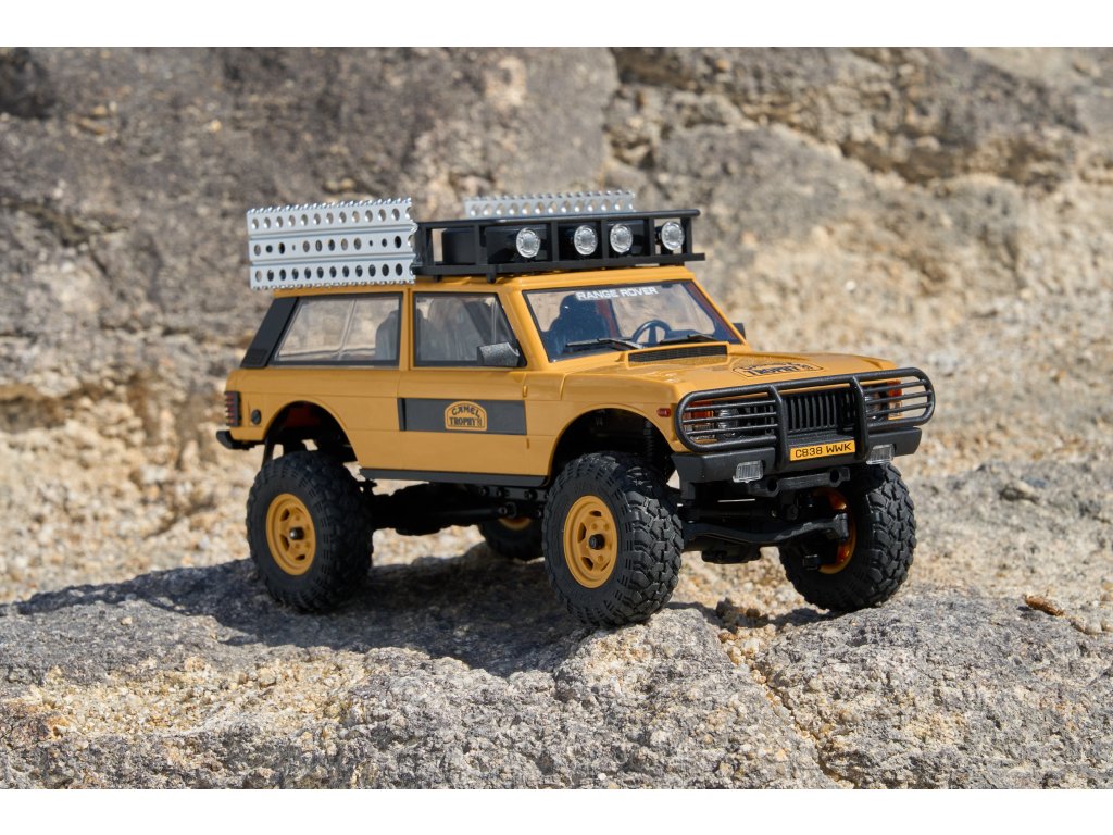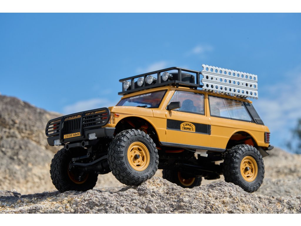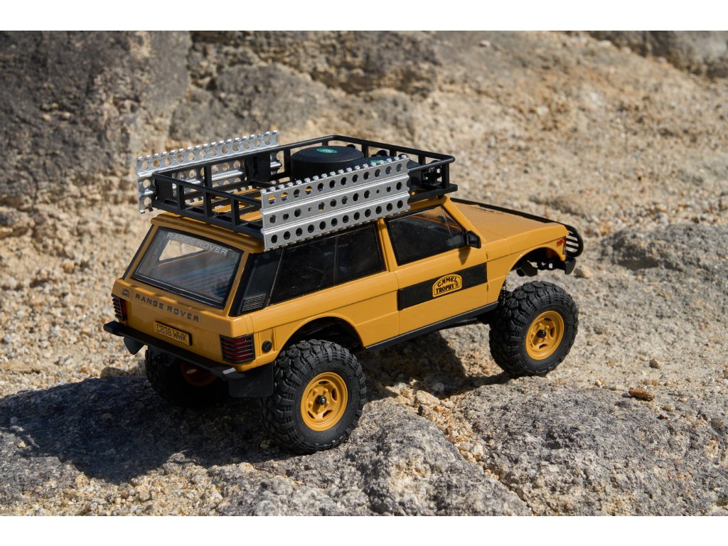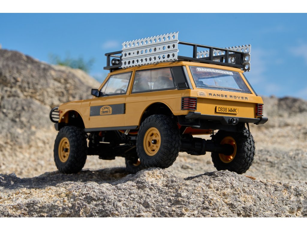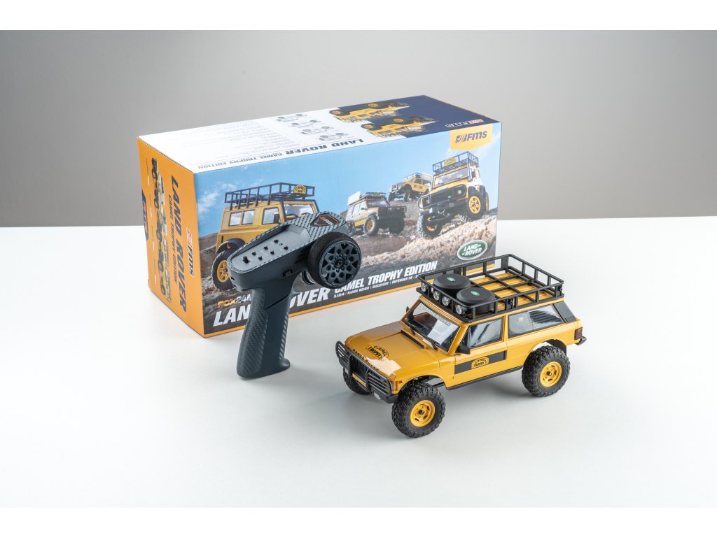 Model FMS FCX24M Camel Trophy Land Rover Range Rover 1:24 RTR je oficiálně licencovaný společností Jaguar Land Rover Limited a přichází s moderním podvozkem nové generace FCX24M. Robustní konstrukce využívá kovové šasi ve tvaru „C“, zatímco karoserie z tvrdého ABS plastu zajišťuje vysokou odolnost v náročném terénu velice realistické chovánï. Díky dvourychlostní převodovce si model poradí jak s rychlejší jízdou ideální pro delší přejezdy nebo sypký terén, či bláto, tak s pomalým technickým plazením. Offroadové pneumatiky poskytují skvělou světlou výšku a výbornou průchodnost terénem. Celý dojem dotváří střešní nosič, který je nainstalován již z výroby, stejně jako další doplňky.